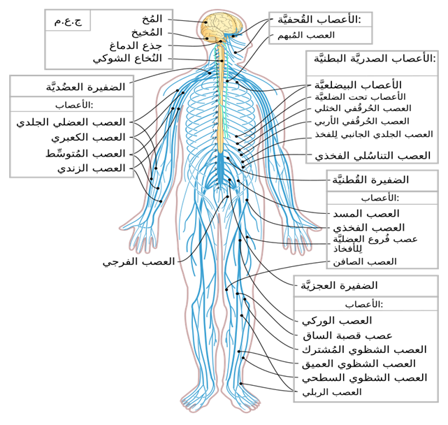 ما يهمنا في هده الصورة : أن كل ما هو باللون الأصفر يعتبر جهاز عصبي مركزي، وكل ما هو باللون الأزرق يعتبر جهاز عصبي محيطي.
