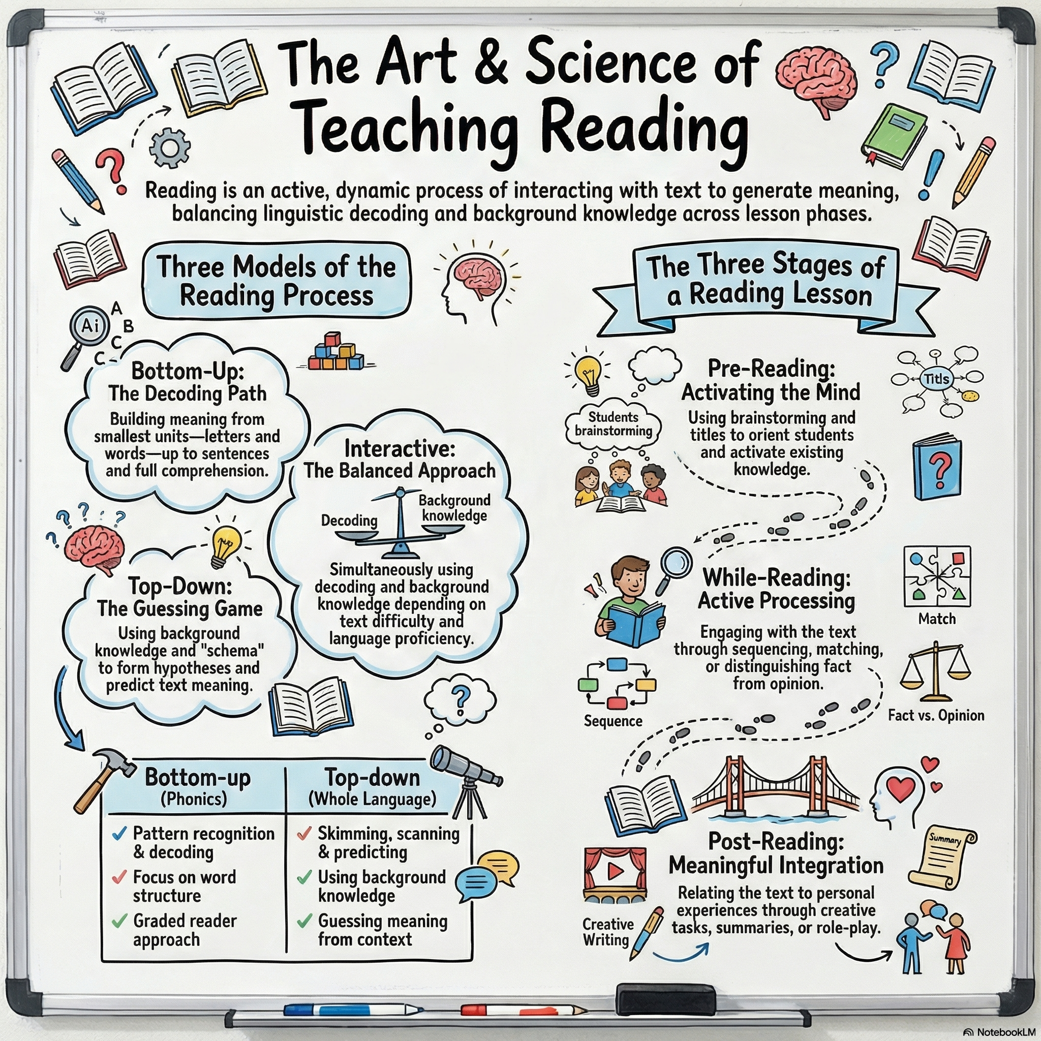 The lesson defines reading as an active, dynamic process where readers interact with a text to generate meaning by combining linguistic information with their own background knowledge. It examines three cognitive models—bottom-up, top-down, and interactive—and details how effective readers adjust their strategies, such as skimming and scanning, based on their specific purpose and the genre of the text. In this lesson we provide a structured framework for instruction, dividing reading lessons into pre-reading, while-reading, and post-reading stages to activate schema, practice active processing, and integrate new language. Finally, the lesson contrasts intensive and extensive reading approaches, emphasizing that teaching should focus on developing practical skills and strategies through authentic tasks rather than simply testing comprehension.