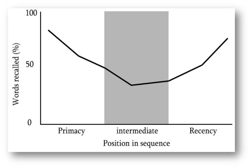 - Primacy Effect: Early words are remembered better because they can be rehearsed more often. These words are more likely to move into long-term memory.