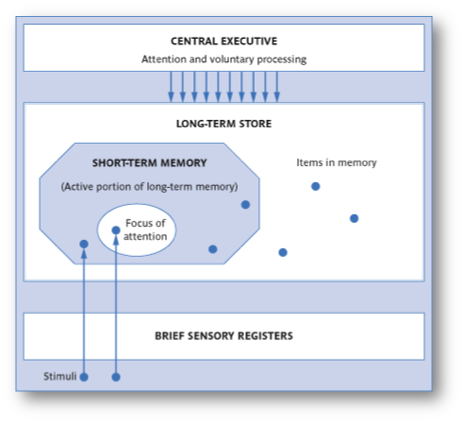 - Sensory Memory/Register: Briefly stores sensory information, lasting no more than a half-second for visual information and 3-4 seconds for auditory information.