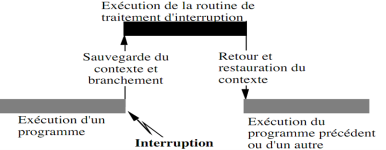 Lorsque l'interruption se produit le processeur, après la fin de l'exécution de l'instruction en cours, transfère le contrôle à la routine d'interruption associée à l'événement.