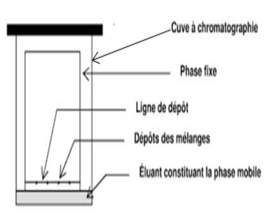 -la plaque est placée en position verticale dans une cuve et le solvant qui en recouvre le fond monte par capillarité.