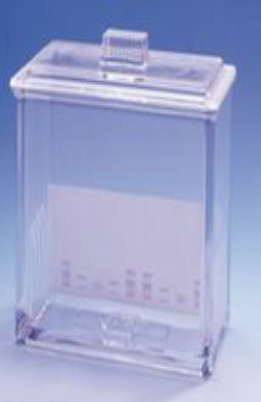 - La cuve chromatographique : un récipient habituellement en verre, de forme variable, fermé par un couvercle étanche.