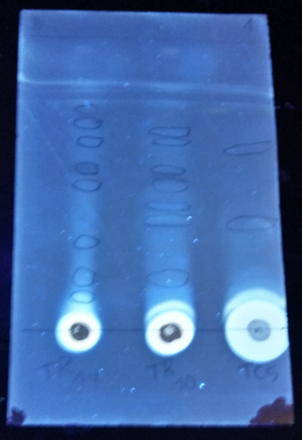 Radiation UV : en exposant la plaque à une source de radiation UV, certains composés apparaissent sous formes de tache brillantes.
