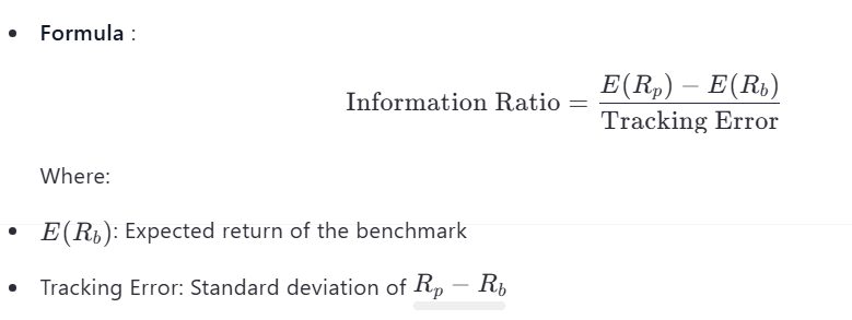 Measures the excess return of a portfolio relative to a benchmark, adjusted for tracking error (the volatility of the difference between portfolio and benchmark returns).