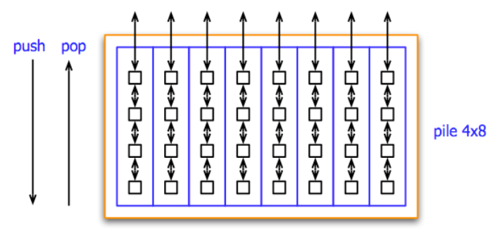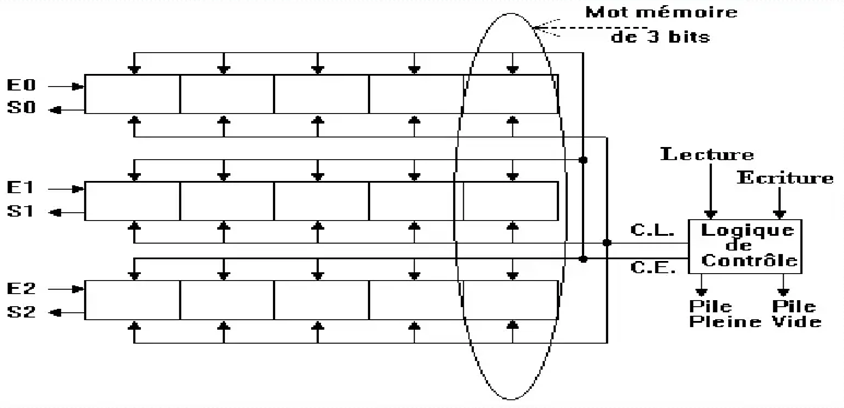 Exemple : Une pile 4x8, peut être vue comme un ensemble de 8 registres a décalage, de 4 bits chacun. Mais contrairement aux FIFO, les registres a décalage sont bidirectionnels et on accède seulement au registre en haut (le sommet de la pile)