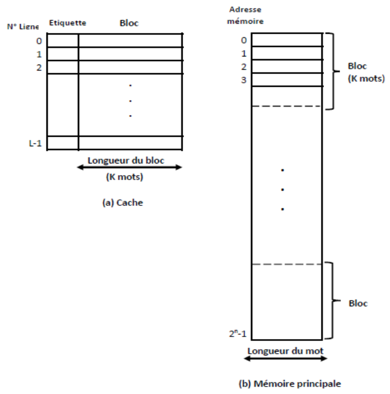 Les mémoires caches contiennent généralement un tableau d’étiquettes qui contient les adresses des données contenues dans le cache et un tableau de données qui contient les données elles-mêmes. La mémoire principale contient jusqu’à 2n mots adressables, chacun possédant une adresse unique de n bits. Pour la correspondance avec la mémoire cache, cette mémoire se compose de blocs d’une longueur fixe de K mots chacun. Autrement dit, il y a M = 2n/K blocs. Le cache se divise en L lignes de K mots.