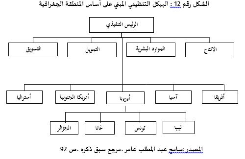في هذا النموذج من الهياكل التنظيمية نجد أن العمليات /الأنشطة الكونية يتم تنظيمها على الأساس الجغرافي بدلا من الأساس السلعي و تقوم الشركة الدولية بتقسيم العمليات الدولية إلى مجموعتين الأولى محلية و الثانية أجنبية و هذا يشير إلى تغيير جوهري في إستراتيجية الشركة حيث توضع العمليات الدولية على نفس المستوى التنظيمي لنظائرها المحلية و الشكل الموالي يوضح لنا ذلك