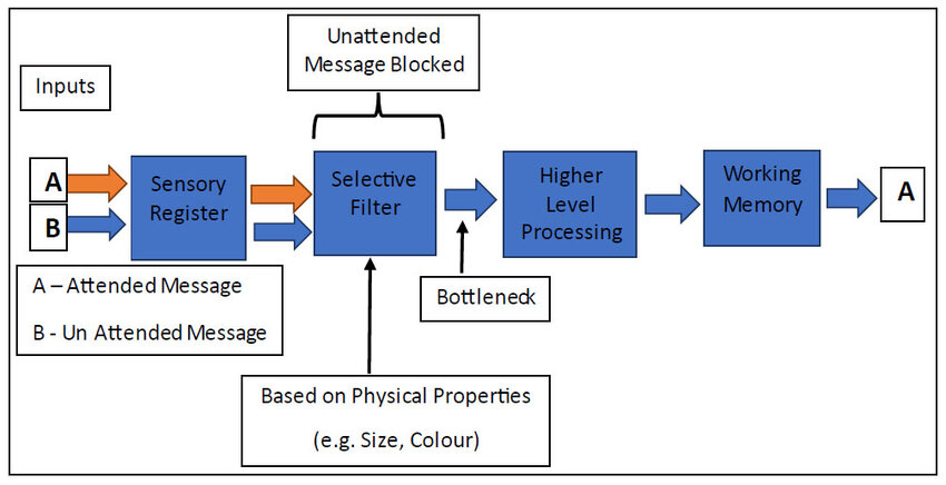 - Filter Model (Broadbent, 1958): This model suggests that information from different sensory channels (e.g., vision, audition) is filtered early in processing. Only the attended channel passes through the filter, while unattended stimuli are completely disregarded. This model is considered an "all-or-nothing" filter.
