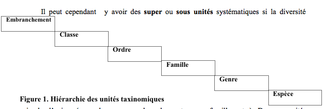 La diversité du monde animal (plus d’un million et demi d’espèces animales connues, de tailles, formes et couleurs diverses) impose que tous ces organismes y soient classifiés selon des critères bien déterminés, c’est la systématique ou la taxinomie (taxis=ordre ; nomos=loi). Il s’agit ainsi d’une  discipline qui se charge de rassembler tous les individus présentant des similitudes morpho-anatomiques au sein d’unités taxinomiques, ces unités sont organisées selon un ordre bien défini (figure 1) :     Il peut cependant  y avoir des super ou sous unités systématiques si la diversité