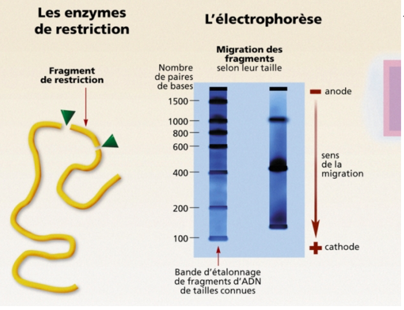 L’action d’une enzyme de restriction génère des fragments de restriction de tailles différentes. L’ADN génomique g énère une population de fragments, l’ADN mitochondrial ou chloroplastique, quelques fragments de taille déterminée. Ceux -ci sont séparés suivant leur taille sur un gel d’électrophorèse.