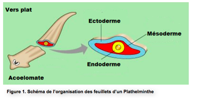 Les plathelminthes sont les triploblastiques les plus primitifs (Ils possèdent trois véritables tissus). Ce sont des vers plats. Ils ne possèdent pas de cavité interne, tous les espaces internes (entre le tube digestif et l’ectoderme) sont remplis de mésoderme, l’espace qui existe entre les cellules mésodermique est comblé par un liquide : l’hémolymphe (figure 1). Les Plathelminthes sont alors acœlomates. protostomiens, hyponeurien et bilatériens. Les Plathelminthes sont à 85% parasites.