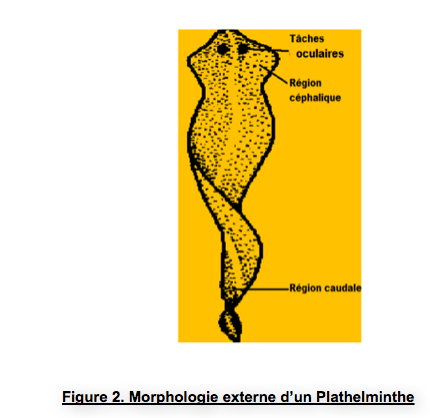 Les Plathelminthes sont des vers plats qui présentent un aplatissement dorso-ventral. Le corps est organisé en deux territoires différents (figure 2):