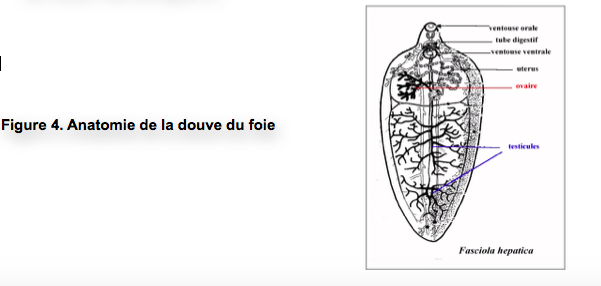 L’exemple le plus connu est celui de la douve du foie Fasciola hepatica, qui vit dans les canaux biliaires du mouton et qui peut être transmise à l’homme par ingestion du foie de mouton mal cuit (figure 4).