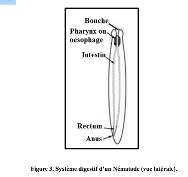 Les Nématodes sont les premiers animaux à posséder un tube digestif complet, c’est à dire muni d’une bouche et d’un anus. La bouche est constituée de trois lèvres, les Nématodes parasites possèdent parfois des dents qui leur permettent de se nourrir des tissus de leurs hôtes (muqueuse digestive, muscles, foie…) Les contractions des muscles longitudinaux du corps ainsi que celles de l’œsophage font progresser les aliments dans le tractus digestif. La digestion est complètement extracellulaire, elle a lieu dans la lumière intestinale grâce aux enzymes sécrétées par des glandes situées autour de l’œsophage. La muqueuse digestive est dotée à présent microvillosités, ces dernières optimisent l’absorption intestinale, les nutriments absorbés, sont dissouts dans l’hémolymphe et redistribués à tout l’organisme (figure 3).