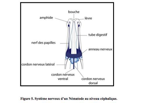 Le système nerveux des Némathelminthes est assez rudimentaire, constitué de cordons nerveux longitudinaux (nerfs sensitifs et moteurs) et d’un collier nerveux ou anneau nerveux entourant l’œsophage musculaire (périoesophagien) (Figure 5).