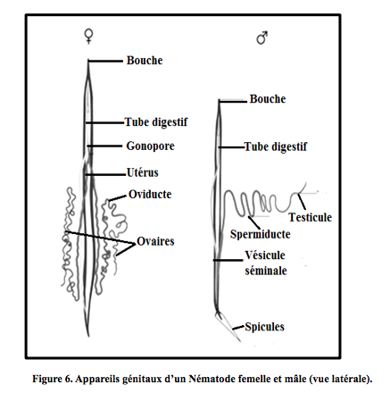 - L’appareil reproducteur mâle comprend (Figure 6), un testicule tubulaire produisant des spermatozoïdes amiboïdes non flagellés, il y’a un renflement en sa partie terminale : la vésicule séminal (stockage des spermatozoïdes), celle-ci qui s’ouvre dans le cloaque, un spermiducte, un ou deux spicules copulateurs et enfin le cloaque.