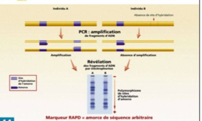 Cette technique consiste à réaliser une PCR en utilisant une amorce courte d'une dizaine de nucléotides, de séquence arbitraire. Cette amorce va s'hybrider au hasard dans le génome. Si deux sites d'hybridation sont proches et sur deux brins d'ADN, il y aura amplification, c'est le cas de l'individu A. En revanche, si ces deux sites sont trop éloignés, il ne peut y avoir amplification, cas de l'individu B. Ainsi, on observe la présence d'une bande sur le gel pour A et l'absence pour B de cette même bande.