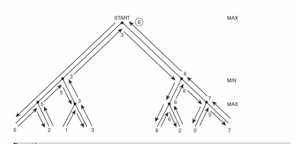Une approche pour programmer la machine pour qu’elle joue et gagne  pourrait être l’utilisation d’un algorithme de recherche déjà vue aux cours précédents tels que, DFS, BFS( la recherche en profondeur d’abord  ou en largeur d’abord) pour trouver un état final ou la machine gagne. Malheureusement cette approche n’est pas praticable parce qu’il y a un autre joueur intelligent (machine ou humain) et rational  qui joue pour qu’il gagne.