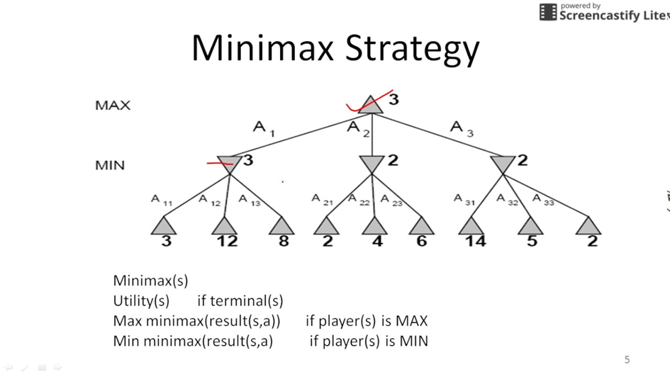 si max choisit l’action ou le coup à gauche. alors min comme agent rationnel  choisira le coup à droite laissant max avec les  choix 1 et 3. Max est aussi rationnel est il cherche à maximiser le gain  choisira  3. Si max commence son choix par le coup à droite min aura le choix entre 7 et 6. Alors il choisira le coup à gauche lassant max avec deux choix 2 et 6.