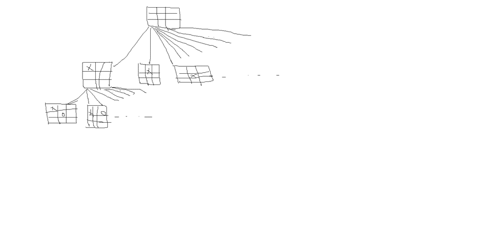 Même pour des arbres de jeux simples tel que l’arbre du tictactoe présenté partiellement par la figure 1. Il est impossible pour la machine de l’explorer  totalement(exhaustivement) parce qu’il a une profondeur minimale de 9 et un facteur de branchement maximal de 9. Cela veut dire que la taille de l’espace d’états (arbre) est 9 != 350,000 états. Cette valeur peut être considéré comme  petite mais pour des jeux tels que chess et go la taille sera très élevée. La machine généralement construit l’arbre jusqu’à un profondeur donnée et utilise une fonction d’évaluation pour évaluer  les états de ce niveau.
