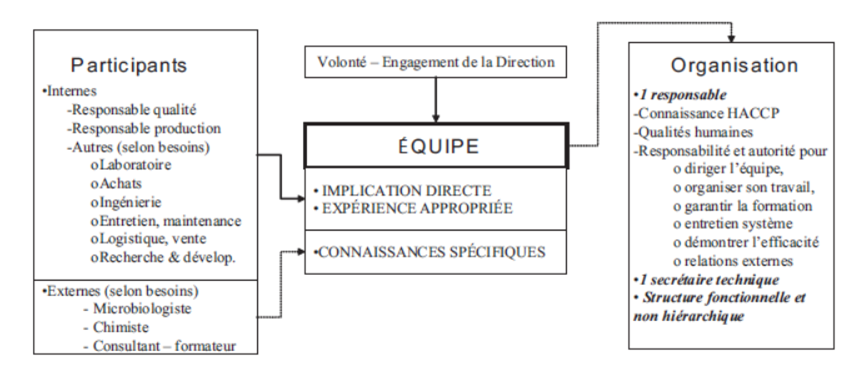 Il est vraiment important que la mise en œuvre de l’HACCP ne soit pas l’œuvre d’un responsable de qualité isolé mais qu’il soit le travail d’une équipe pluridisciplinaire : l’équipe chargée de la sécurité des denrées alimentaires. Idéalement cette équipe doit se composer par des personnes issues de différentes fonctions de l’organisme. Il est possible, quand le besoin s’en fait ressentir, de faire appel à des experts externes (microbiologiste, consultant, fournisseur par exemple).