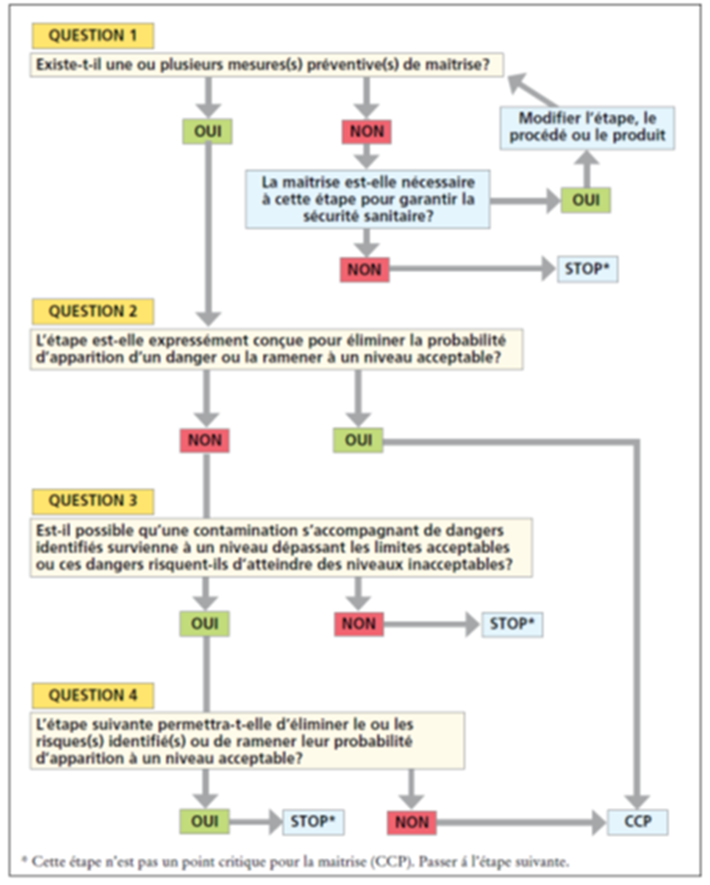 La détermination d'un CCP dans le cadre du système HACCP peut être facilitée par l'application d'un arbre de décision (exemple d'arbre de décision) qui présente un raisonnement fondé sur la logique. Il faut faire preuve de souplesse dans l'application de l'arbre de décision, selon que l'opération concerne la production, l'abattage, la transformation, l'entreposage, la distribution, etc. Il doit être utilisé à titre indicatif lorsqu'on détermine les CCP. Si un danger a été identifié à une étape où un contrôle de sécurité est nécessaire et qu'aucune mesure de maîtrise n'existe au niveau de cette étape ou de toute autre, il faudrait alors modifier le produit ou le procédé correspondant à cette étape, ou à un stade antérieur ou ultérieur, de manière à prévoir une mesure de maîtrise.