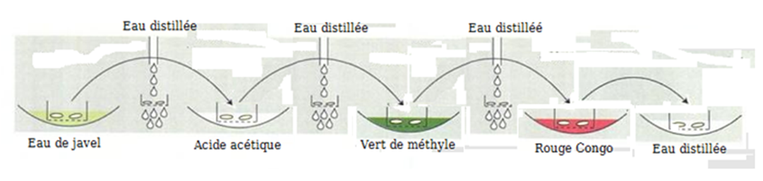 - Eau distillée, glycérine, eau de javel, acide acétique, colorants (vert de méthyle et rouge Congo)