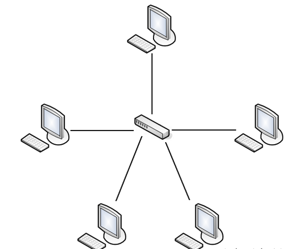 La forme physique du réseau ressemble à une étoile, toutes les machines se connectent à un équipement central ( qui est généralement un commutateur) et chaque communication entre ces machines doit passer par cet équipement.