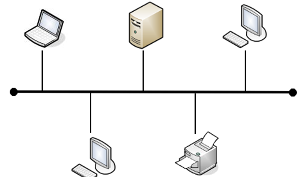 Dans cette topologie, tous les ordinateurs sont connectés entre eux par le biais d'un seul câble réseau débuté et terminé par des terminateurs. Les terminateurs ont pour but de maintenir les (signaux électriques dans le câble et d'empêcher les "rebonds" des données le long du fil.