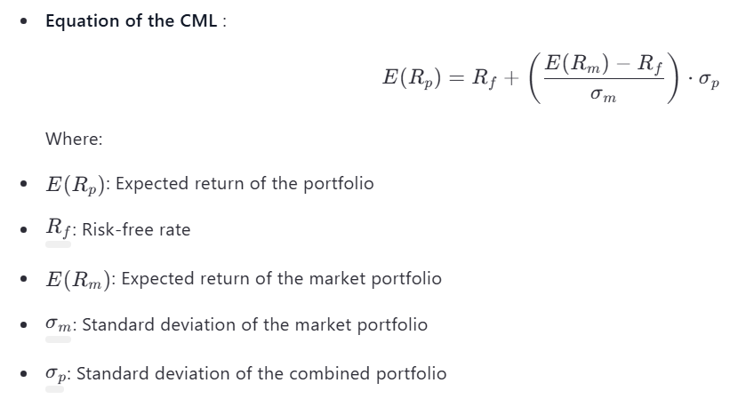 • The CML starts at the risk-free rate () on the y-axis and passes through the market portfolio on the efficient frontier.