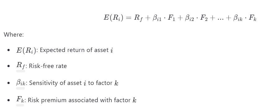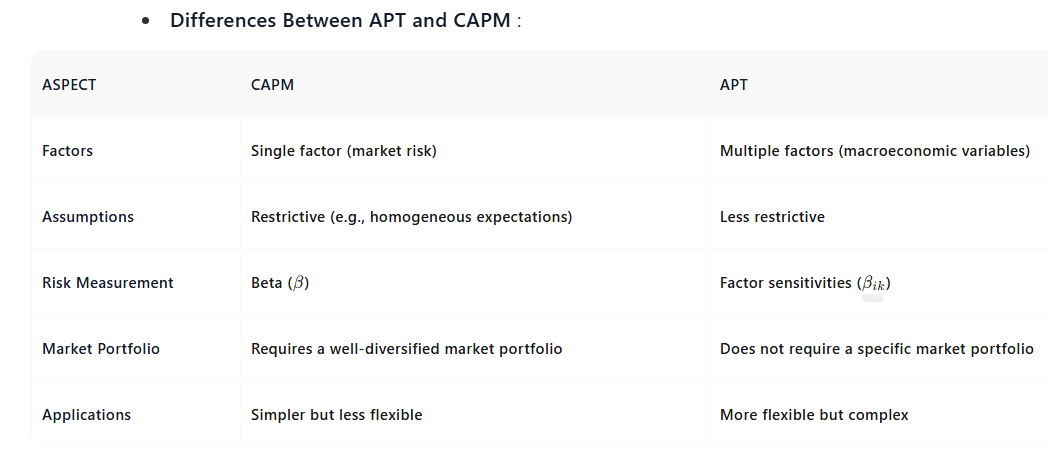 - APT assumes that asset returns are influenced by multiple macroeconomic factors, rather than just market risk () as in CAPM.