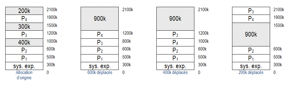 The figure bellow depicts three possible ways with three different costs to compact the given memory case (most left sub-figure).