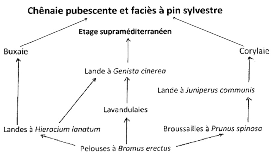 enchaînements parallèles aboutissant à la chênaie à Q. pubescens supraméditerranéenne. La série supraméditerranéenne du chêne pubescent est, de loin, la succession la plus importante des Alpes du Sud.
