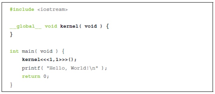 L'astuce consiste en fait à appeler le code du device à partir du code du host. Les crochets (<<< …>>>) désignent les arguments que nous prévoyons de transmettre au runtime.