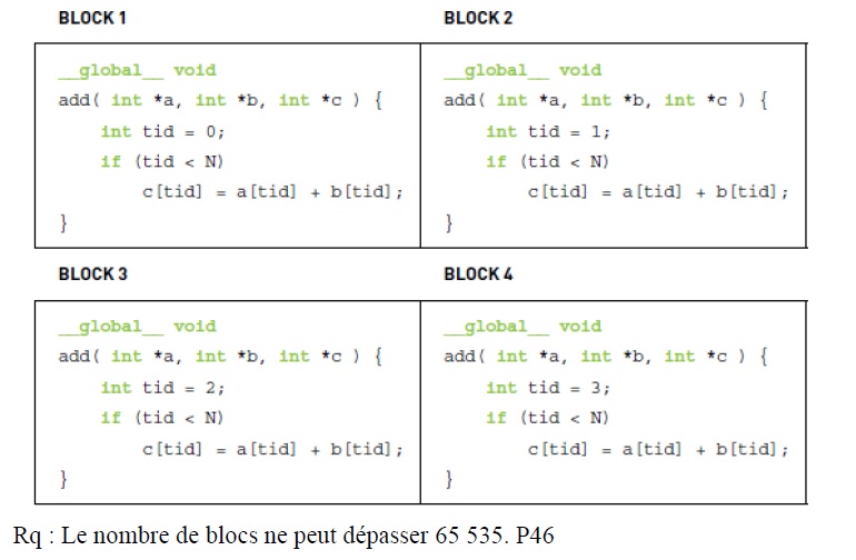 Int tid=blockIdx.x : Ces threads auront des valeurs variables pour blockIdx.x, le premier prenant la valeur 0 et le dernier prenant la valeur N-1. Si N=4 voici comment le calcul se déroule :